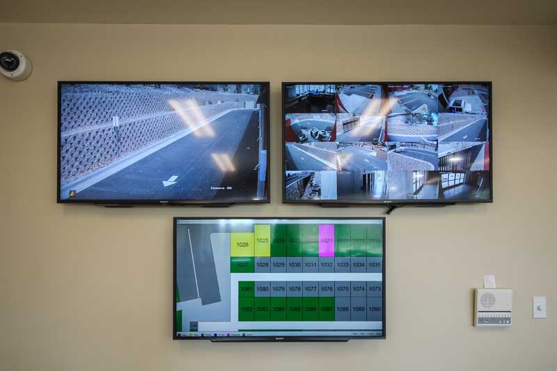 Security footage on display in the front office of a storage facility.