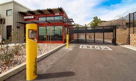 Exterior of the leasing office of a self storage facility.